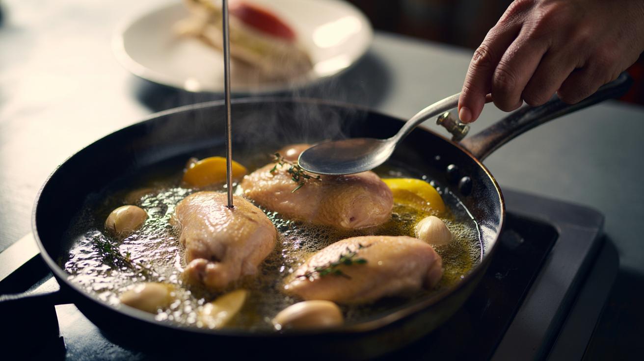 Traditional confit is low-and-slow. This streamlined version borrows the principle, not the timetable. Fat is a superb heat transfer medium; it surrounds the meat, minimises evaporative loss, and prevents the surface from seizing. Keep the oil at a gentle 85–95°C and you’re essentially running a precise, stovetop sous-vide. Thin cutlets or thigh chunks reach doneness evenly without drying. Aim for an internal temperature of 75°C for safe, juicy chicken. Garlic, warmed at this low heat, mellows into sweetness and releases fat-soluble flavour compounds that bloom into the oil, turning it into an instant sauce.